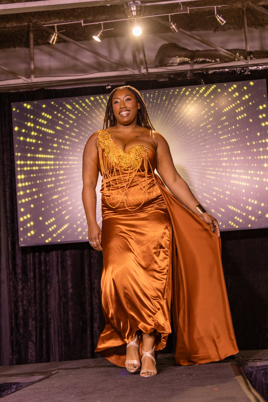 Radiate confidence and elegance in this stunning honey-gold bodycon dress. Designed to flatter the silhouette, this piece features a sleek, figure-hugging fit that highlights natural curves while offering a polished and sophisticated look.